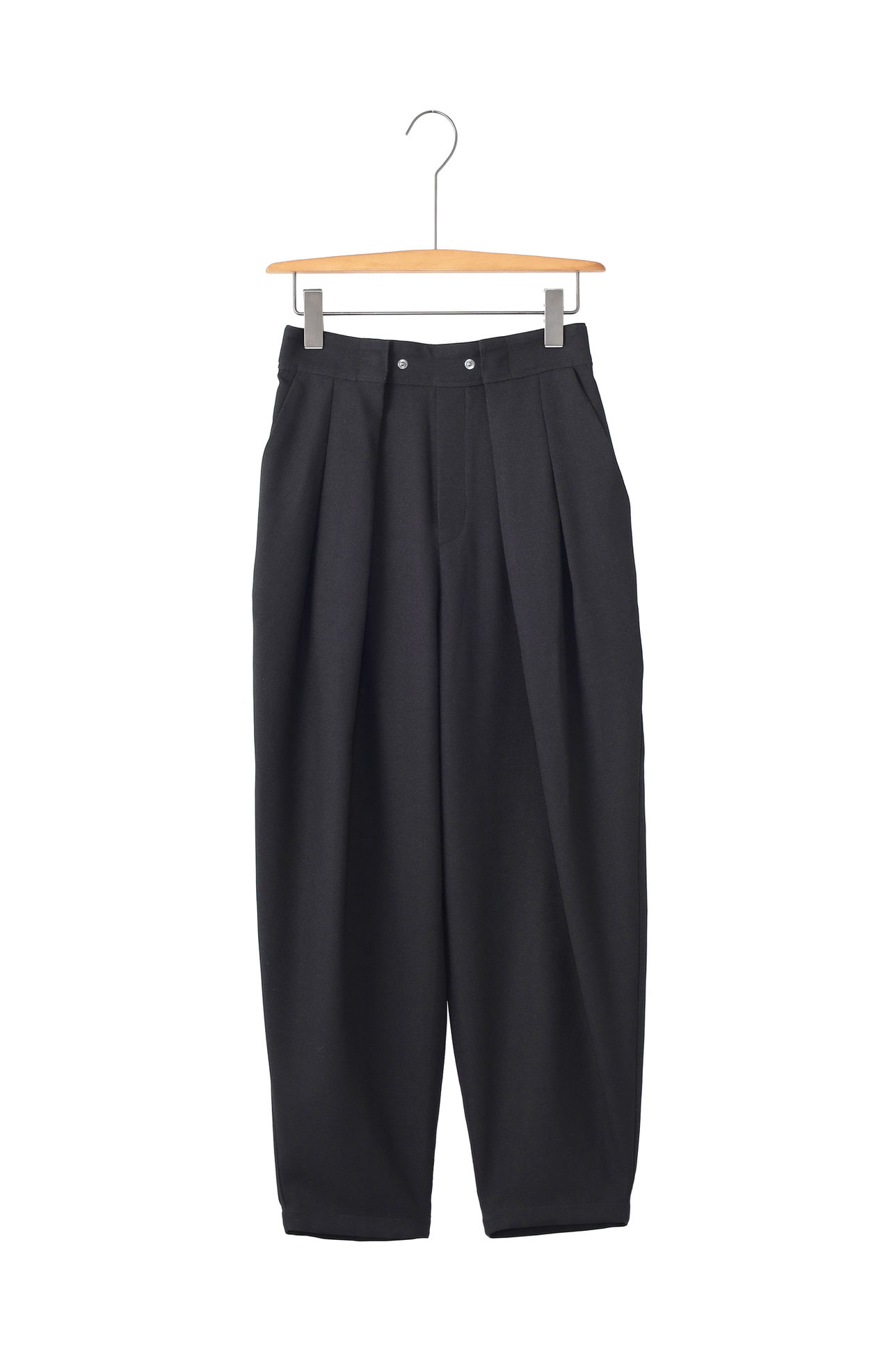 麻のようなナチュラル感とドライな風合いでシワになりにくく毛羽立ちにくい吸汗性、通気性、透湿性も兼ね備えた多機能素材です。タックを増やし腰回りに分量を持たせ少し短めのテーパードシルエットに仕上げました。