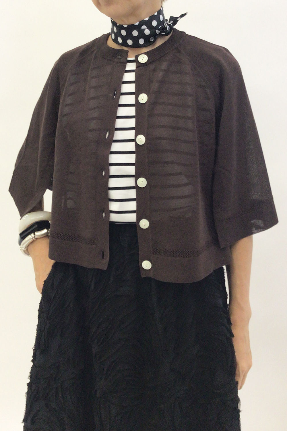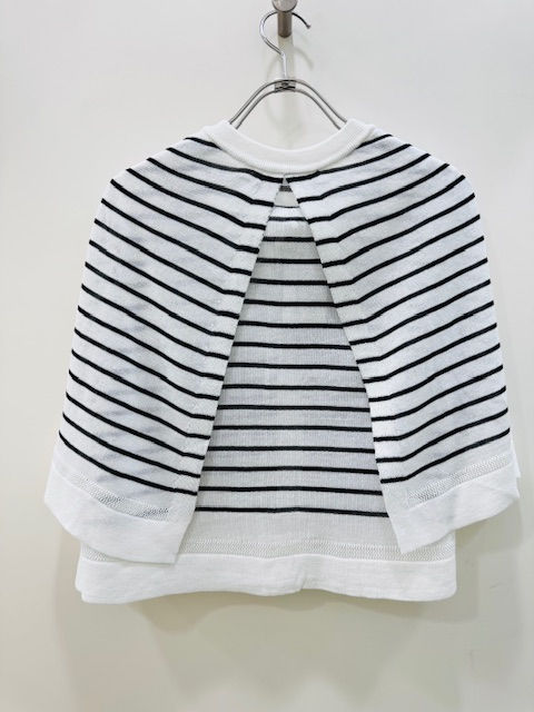 極細の綿糸をギマ加工でテープ状にし、麻の様な風合いに加工された糸、 ハリ・コシがあって軽く編み上がる夏らしい素材です。 昨年人気だったケープ型のカーディガンです。 脇が開いているので涼しく快適の上、二の腕は隠せるという優れものです。 今年はボーダーも仲間入りしましたので、 昨年無地を買われた方 今年はボーダーはいかがでしょうか?