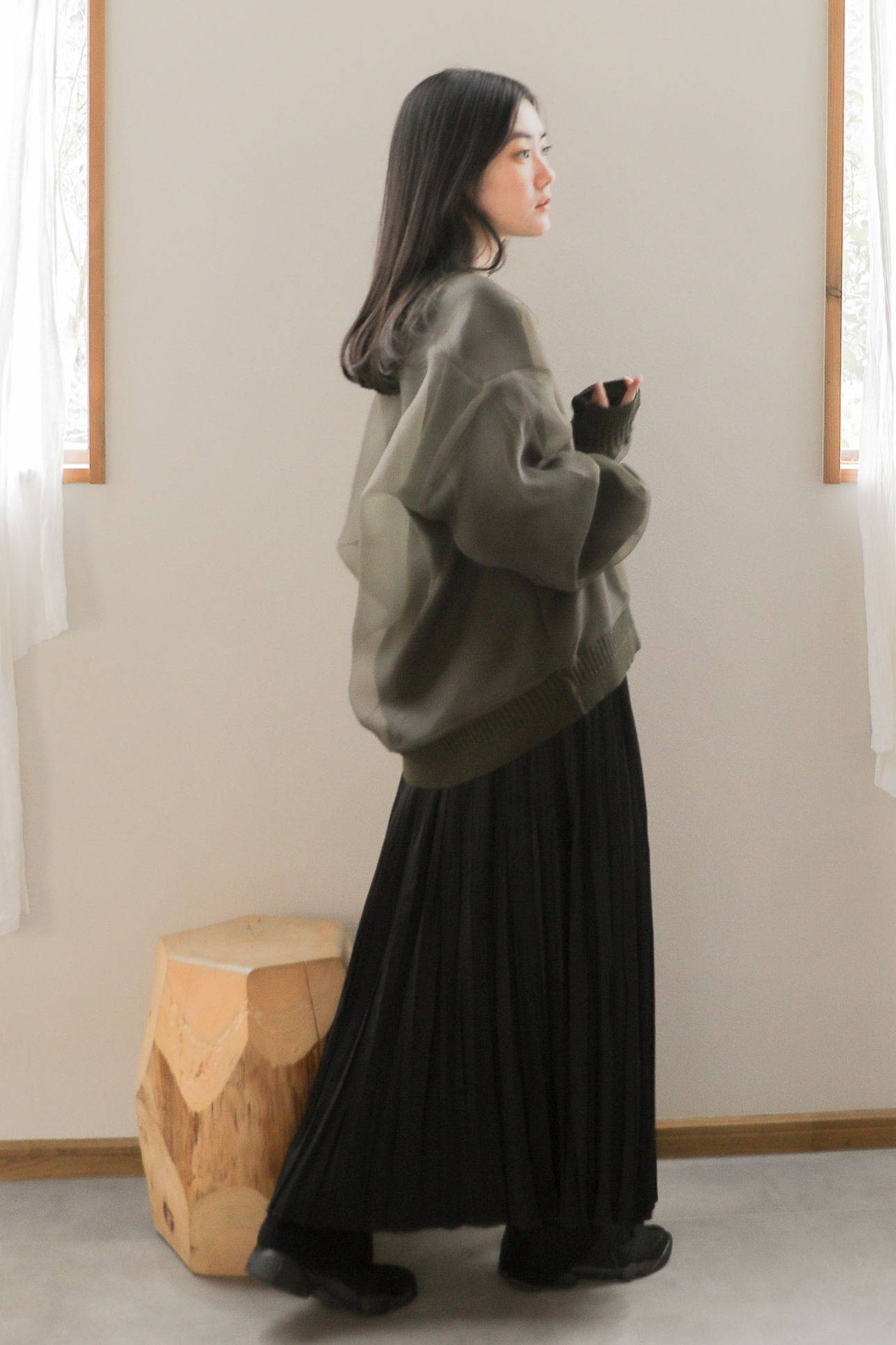 オーガンジーコンビのリバーシブルハイゲージニットカーディガン。アクリルコットンのハイゲージニットにオーガンジーを重ね、リバーシブルで着用できる仕様にし、裏返した時に天竺が表になる仕様。フロントに厚みを出し、大きめの金属スナップ釦で留めるのがポイントです。ゆったりとしたメンズライクなサイズ感に仕上がっています。