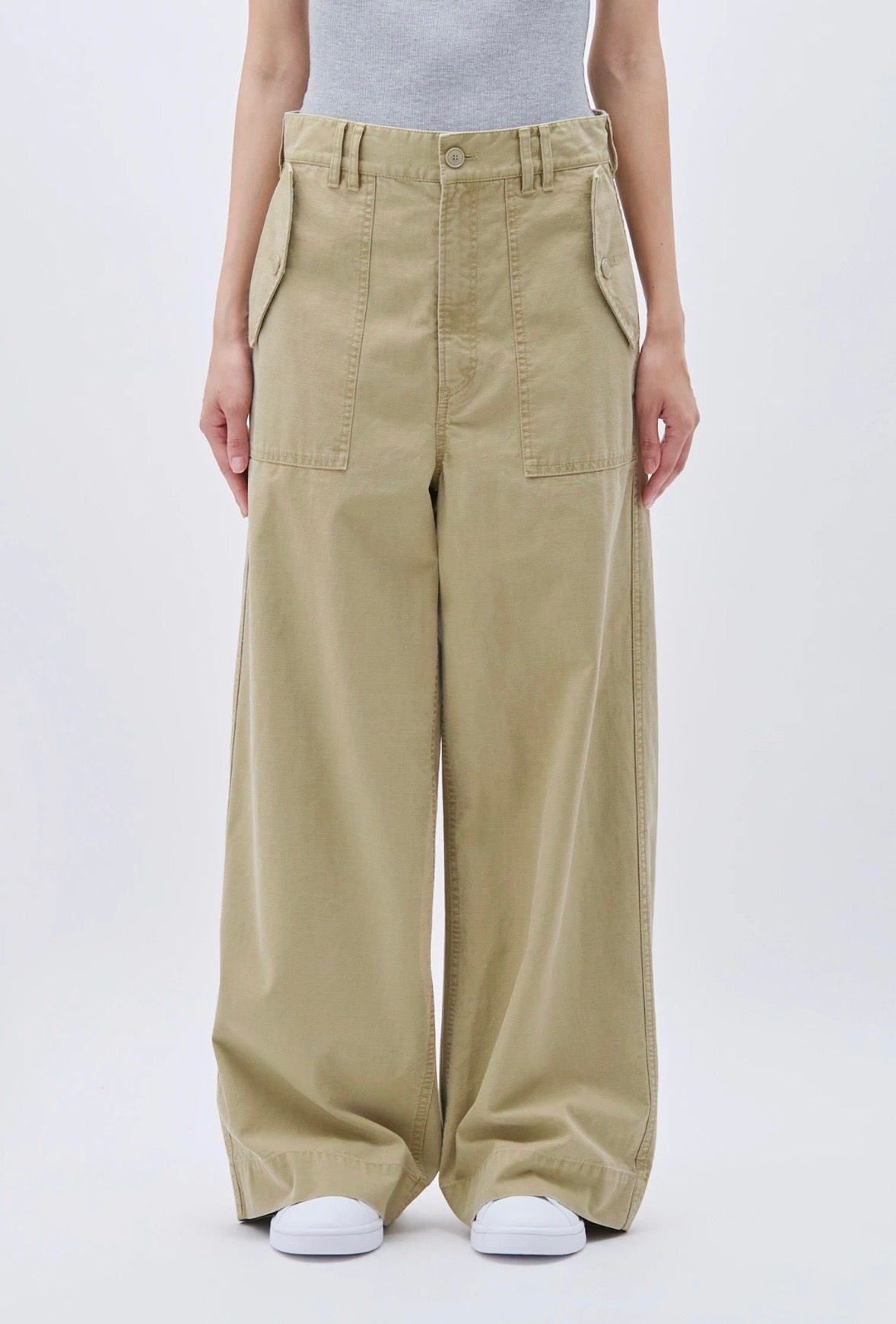 upper hightsのフラップデザインポケットのベイカーパンツ「THE BLUTO(ザ ブルート)」 ミリタリーライクなバックサテン素材で仕立てた、太めのワイドストレートパンツ。ウエストをゆるっと落として腰ばきでも、後ろの尾錠をぐっと絞ってはいても可愛い1本です。